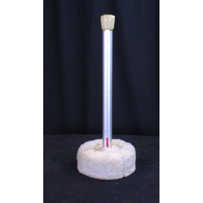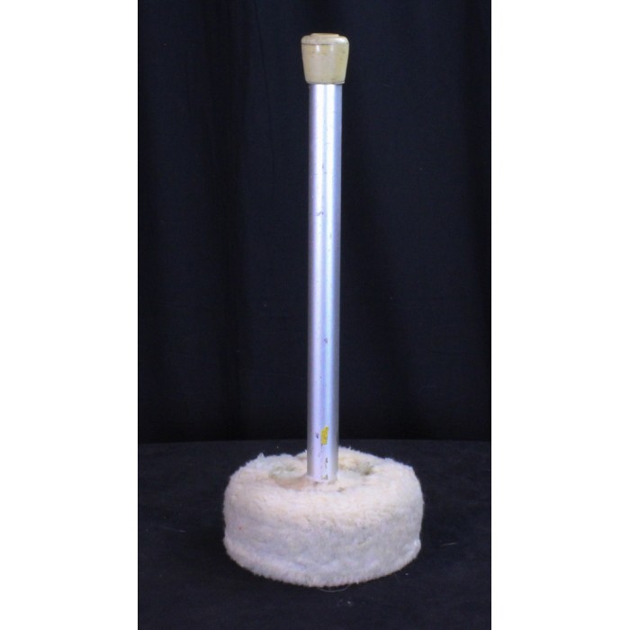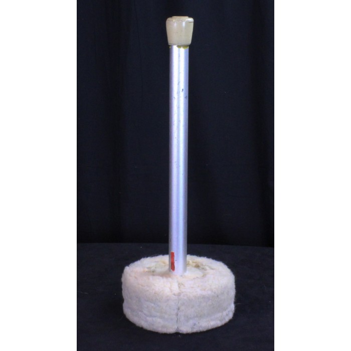 Vintage Hinger Touch-Tone tam tam/gong mallet. This is one of the most useful tam tam/gong mallets ever made. It has a heavy aluminum shaft and heavy head that is the perfect weight for large gongs or tam-tams. The head has a hard and soft side which is indicated by two different colors of tape on the shaft. The yellow side is soft and the red side is hard. Another useful feature is that the head is large enough for the mallet to stand upright on the stage floor. The player can place it next to the instrument in the perfect playing position making quick changes to the tam-tam much easier to execute. The mallet head has been re-covered in thick white fake "fur" which is the perfect covering to produce a great sound on large tam-tams. The overall length is 17 1/2". The head diamter is 7". As with many of the earliest Hinger mallets there is no Hinger Touch-Tone stamp on the shaft but the original tape markings are in place. Add this genuine Hinger mallet to your collection of Hinger sticks and mallets.