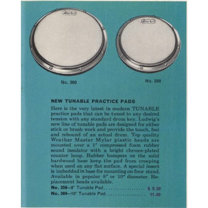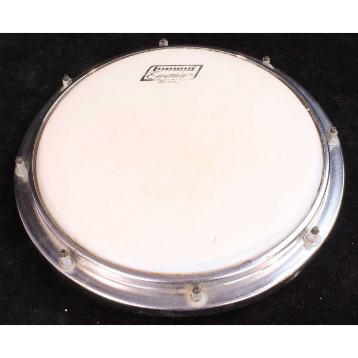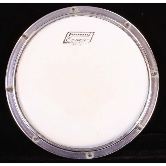 This is a Ludwig Tunable practice pad from the 1970's in excellent condition. The Ludwig tunable practice pad, introduced in the late 1960's is probably the nicest, most responsive practice pad ever made. This pad is the smaller, 8" diameter pad. It is all original including the Ludwig ensemble head. It has its original rubber feet mounted to the bottom. This model pad can be attached to a cymbal stand using the threaded attachment on the bottom and can be tuned with a standard drum key. The head has one tiny tear but the pad is in excellent condition overall and is a joy to play making this a nice addition for a practice pad collection or for a practicing drummer.