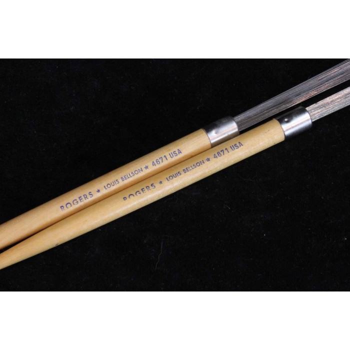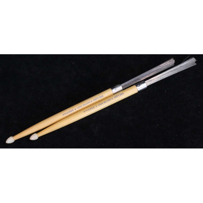 This is a rare 1960's pair of Rogers Louis Bellson combination brushes/sticks in New Old Stock (NOS) condition. This pair of nylon tipped drumsticks is half drumstick, half wire brushes. These brushes have never been used. There is not a dent or scratch anywhere on the wooden portion of the sticks and there are no wires out of place. This is an exceedingly rare pair of sticks in show condition that will make a unique addition to any vintage Rogers outfit.