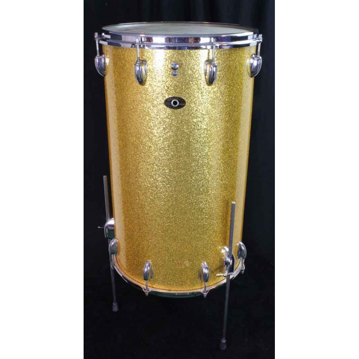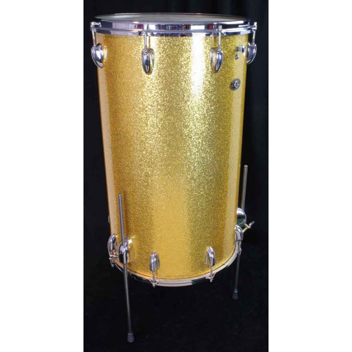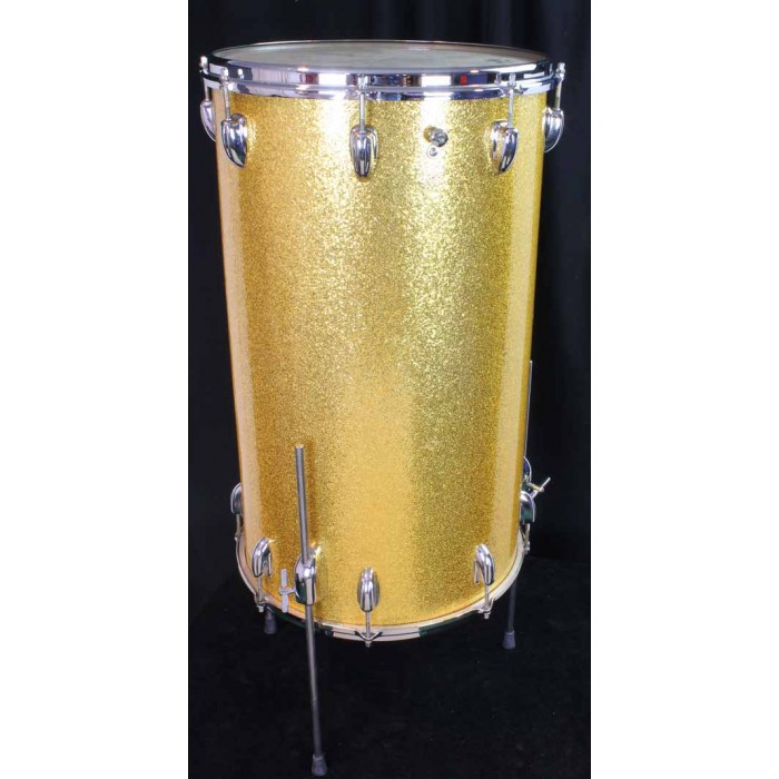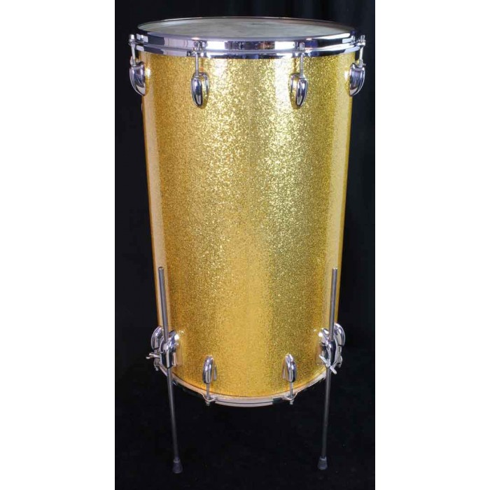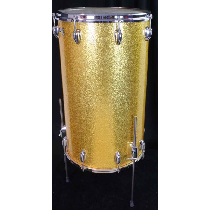 This is terrific looking late 60's Slingerland two-headed Cocktail Drum with gold sparkle wrap. It is complete including original internal snares under the top head and internal muffler. All of the chrome hardware is in beautiful condition. The gold sparkle wrap is also in great condition with no issues. The straight legs are reproductions but all other parts are original and in perfect condition. Cocktail drums are rare birds so they make great additions to drum collections and are very useful items for the working drummer. Add a pedal and a cymbal to make a complete gigging outfit.