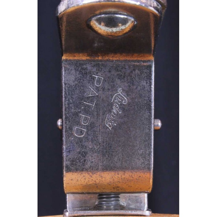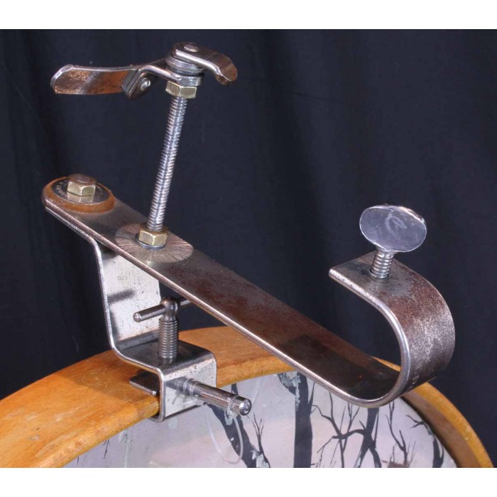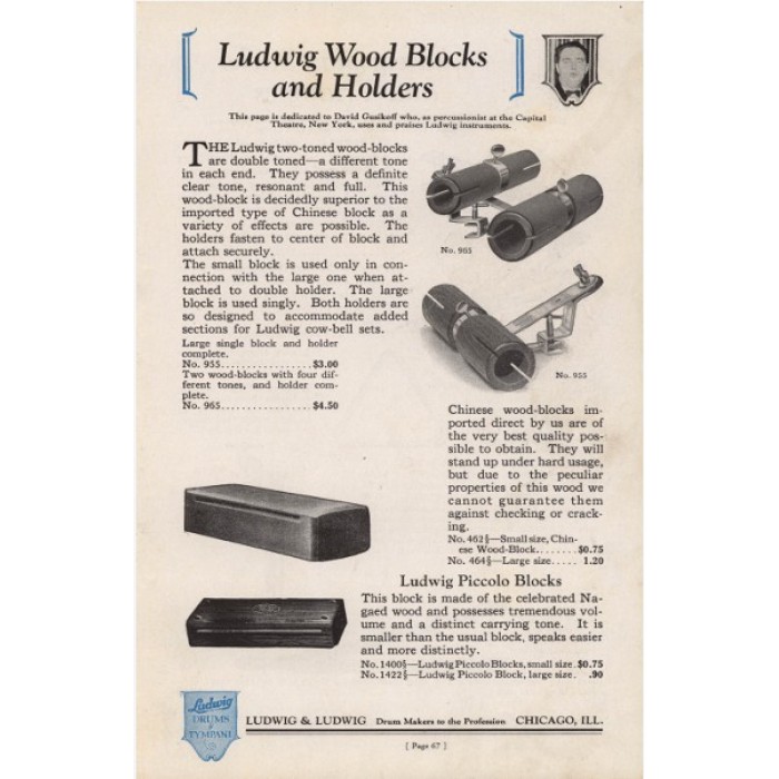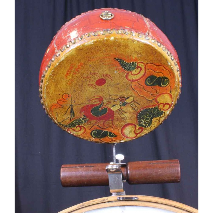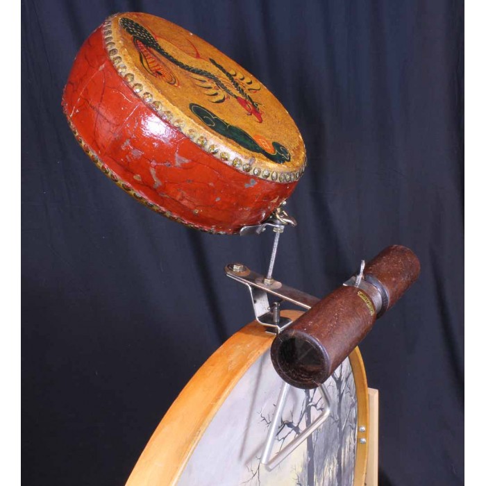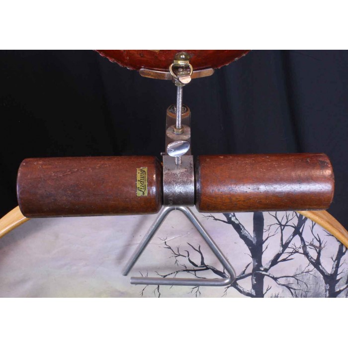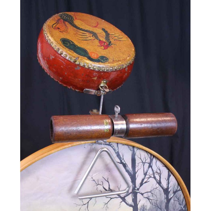 This is a beautiful 1920's Ludwig two-toned block and Chinese tom tom set with small triangle. As shown in the attached 1928 Ludwig catalog, the model No. 955 multi-clamp is used as the base for this compact set of useful traps that can be mounted to a bass drum counterhoop. It includes a Ludwig branded two-toned cylindrical woodblock, 10" Chinese tom tom and 5" triangle. All three traps are in excellent condition. The two-tone block has a clear Ludwig decal. Both sides of the block sound great with no cracks or chips. It is 11" in length with a 2 1/8" diameter. The 10" Chinese tom tom also sound great with two beautifully painted heads that had no holes or missing tacks. The 5" triangle is unbranded but appears to be a Ludwig triangle from the era. The nickel plating on the multi-clamp is in excellent overall condition with only some slight plating loss in a few spots. This set-up is typical of the combination of traps drummers from the vaudeville era used for their shows. It's a quick, unique way to extend the range of effects to any vintage outfit from the 1920's.