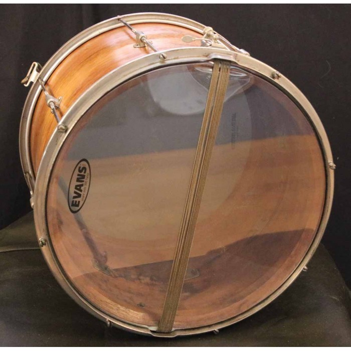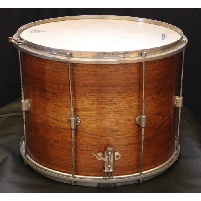 This is an early 1920s, solid Walnut shell, 12”x15” Field drum in excellent original condition. These drums were described in the late 1920's Leedy catalogs as having "floating" heads because the flesh hoop fits into the metal flange on the counter hoop. This is the modern design that is common now but was a new development in the late 1920's. This drum has undergone light restoration. The shell has been cleaned and refinished and the hardware was lightly cleaned. The wire-wound silk snares are original to the drum. Modern heads fit nicely beause the shell is “in round.” Inside the shell are the numbers 37866 written in pencil and partially hidden by one of the lug backing plates. Also written inside the shell in pencil is the name H E Moulton, presumably one of, if not the original owner(s) of the drum. The date “June 29-36 all weather heads” is also written in pencil on the inside of the shell. We can only speculate that this was a date that new calf heads were put on the drum. Unfortunately, these original calf heads did not survive.