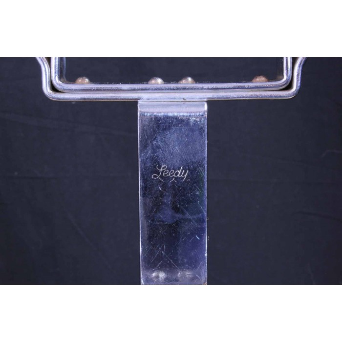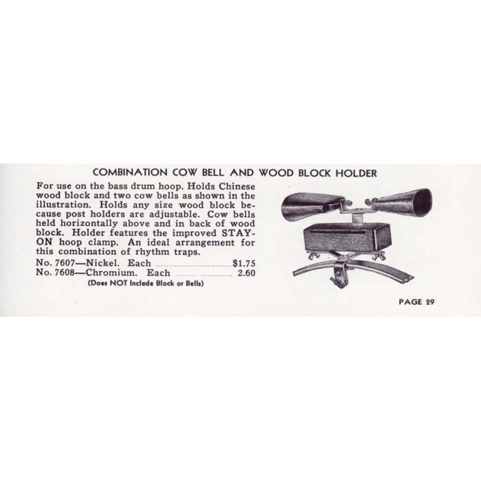 This is a Leedy combination CB and WB holder complete with woodblock and two cowbells. As shown in the attached 1944 Leedy catalog, this model no. 7607 mount holds two cowbells above the level of the single woodblock. The woodblock mount consists of two metal posts the can be adjusted to hold a woodblock up to 9" wide. This set comes with an era correct rosewood two-sided Chinese woodblock measuring 7 1/2" x 2 1/8" x 3". Both sides of this block sound great. Two era correct cowbells are also included. The smaller cowbell measures 4 1/2" across the mount. The larger bell is 5 3/8" across. The mount is in near mint condition with all original thumb screws and a clear Leedy script logo on the riser. This is a great set to add to a vintage Leedy outfit.