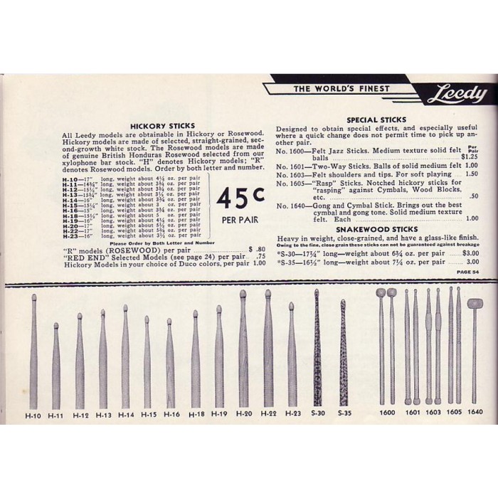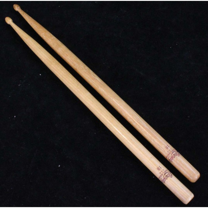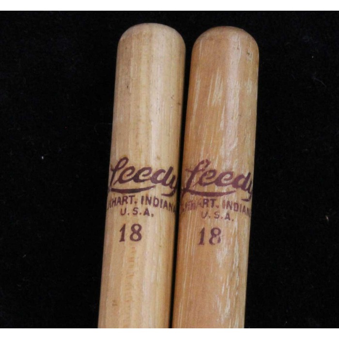 This is an extremely rare pair of Leedy H-18 hickory drum sticks from the 1930's. The pair is in near mint condition with a clear purple Leedy Elkhart, Indiana stamp on the butt of each sticks. There are a couple of small dents on each stick but the finish is in beautiful shape and the sticks are smooth to the touch with no splintering or chipping. This pair will make a nice addition to any Leedy outfit or drum stick collection.