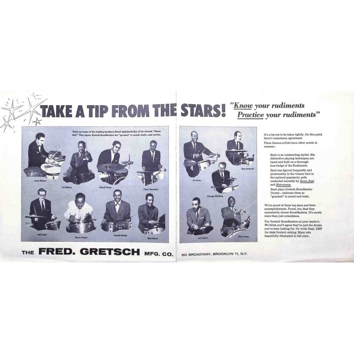 This is an unusual Gretsch rudimental drumming tri-fold advertisement flyer. It's folded dimensions are 9" x 9 1/4". Unfolded, it is 9" x 27 5/8". The interior of the flyer shows each of the 26 Strube drum rudiments with sticking and annotations. The front cover includes a description of the utility of the information and the back cover shows two full pages Gretsch endorsers from the era including historic photos of jazz greats like Max Roach, Art Taylor, Elvin Jones, Art Blakey, Don Lamond and many others. This is a cool piece of memorabilia that will make a nice studio wall decoration for any Gretsch drum enthusiast.