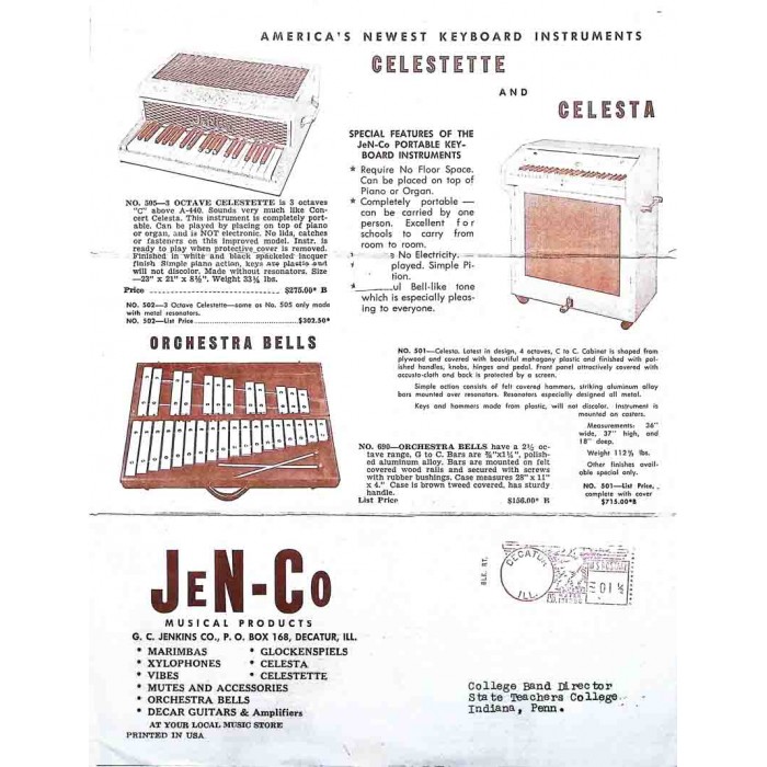This is a rare G. C. Jenco tri-fold keyboard instrument catalog from the early 1960's. This catalog circa 1962 is printed on heavy paper and folds out accordion style to show all of the keyboard percussion instruments offered by Jenco. It is complete with its original postmark and address to the music department at Indiana State Teacher's College which is now Indiana University of Pennsylvania. This rare flyer will make a great addition to any catalog collection.