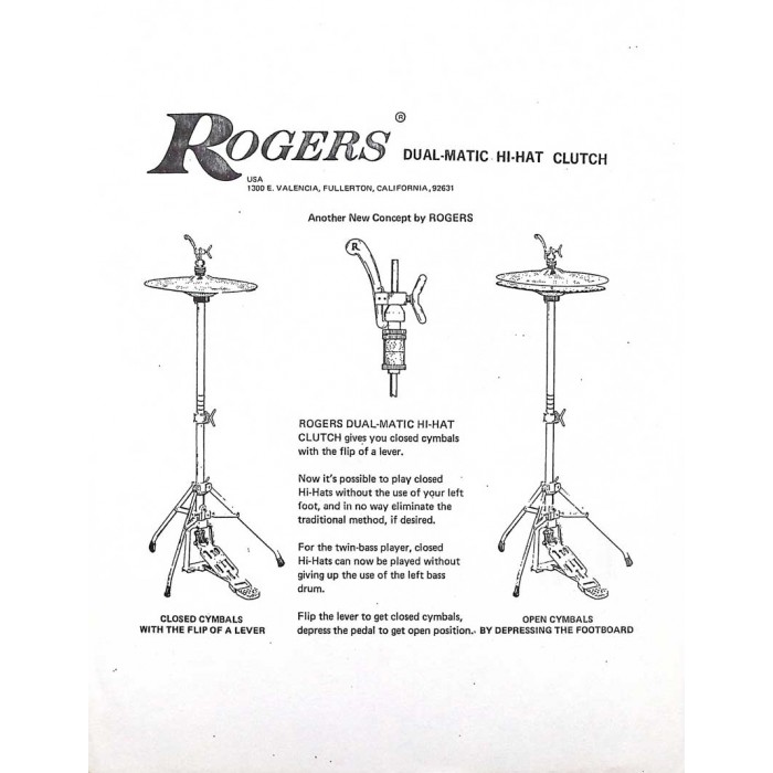 This is a pair of Rogers Memriloc information sheets from the 1970's. One of the sheets explains the hoop spacers Rogers introduced to to protect drums with one head removed. The second sheet explains the Rogers "drop" hi-hat clutch. The two sheets are in excellent condition and provide a rare example of Rogers marketing material from the Memriloc era.