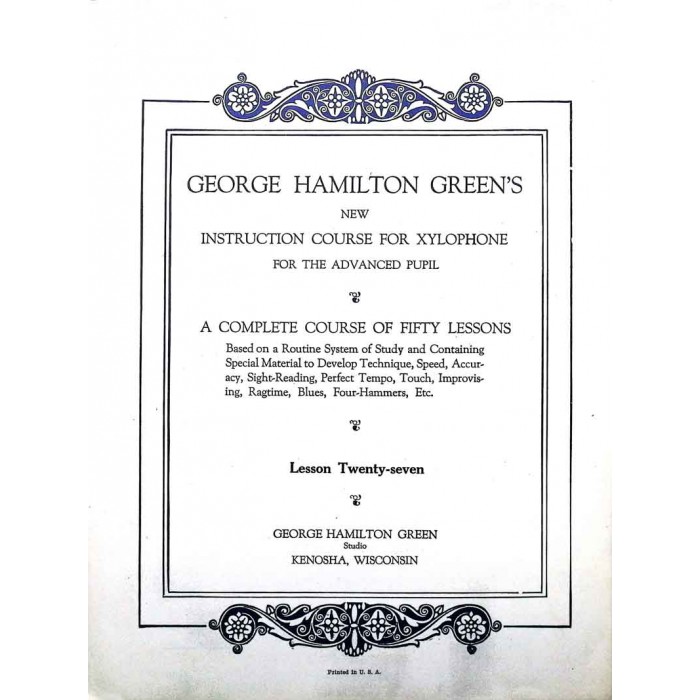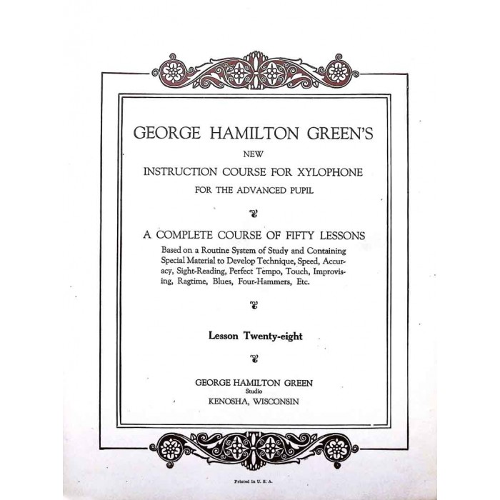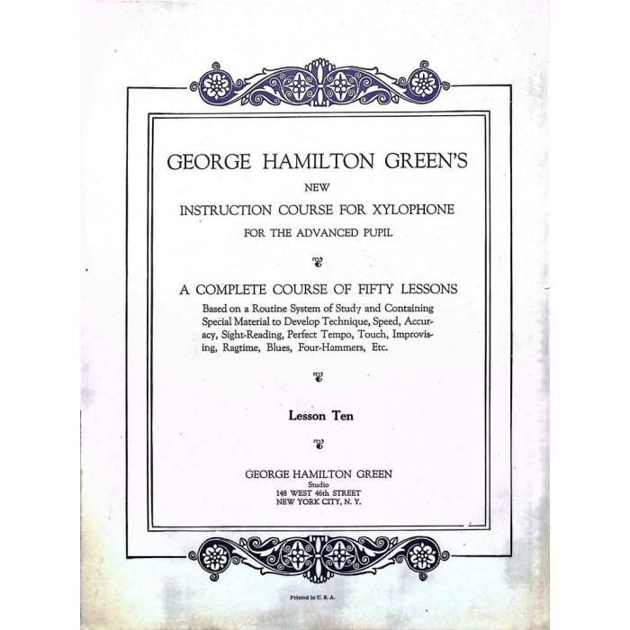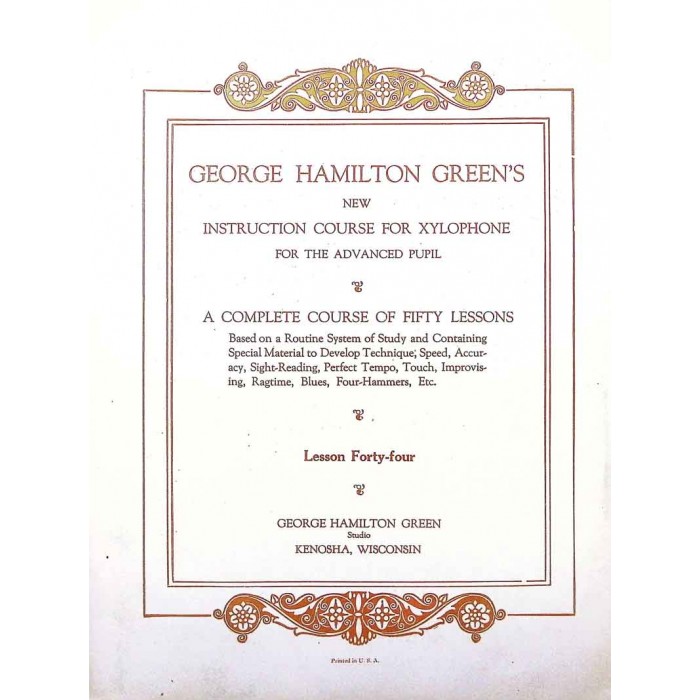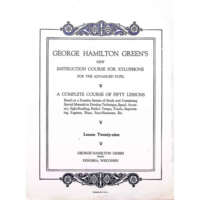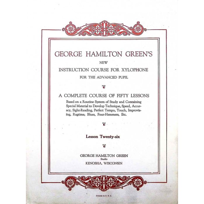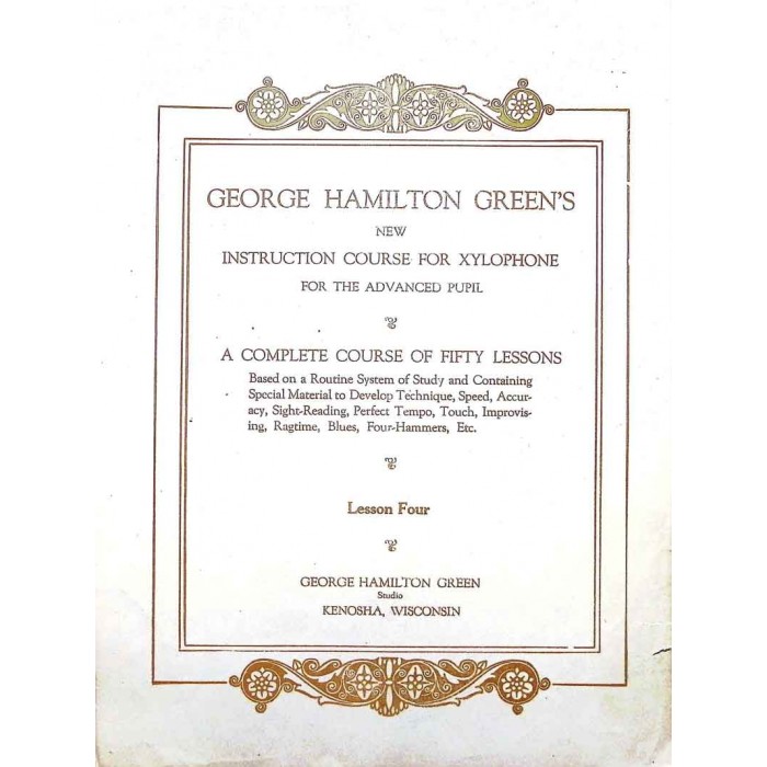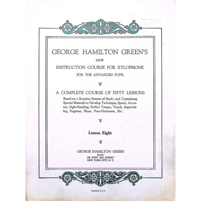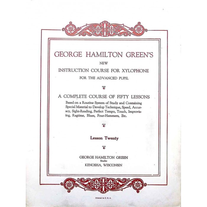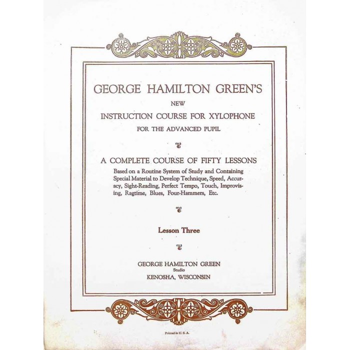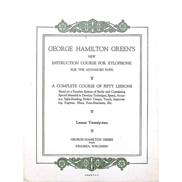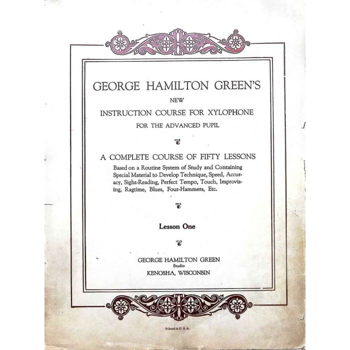 This is a beautiful collection of complete, original edition, George Hamilton Green "Instruction Course for Xylophone" in its original carboard box. This collection includes all 50 individual lessons, each printed as a separate pamphlet. It also includes several additional items from Green's instruction course including his 8 page, "Four Hammer Playing" guide, 2 page, two mallet playing guide, 4 page Rules for Practice, and a catalog plice list for G. H. Green's printed instruction and solo works from the era. Each of the 50 pamphlets in this set is in excellent condition with no tearing or water damage. The original paper has yellowed slightly but the lessons are clearly visible and easily read. A few of the early lessons have separated along the pamphlet edge so they are individual pages. Each pamphlet has a beautifully decorated front cover in various colors. Most of the pamphlets have other George Hamilton Green publications listed on the back cover. These 50 lessons are a great resource for the mallet percussionist and ragtime soloist that are still practiced and studied today, almost 100 years after they were copyrighted in 1926. These original editions will serve as the centerpiece to any keyboard percussion library.