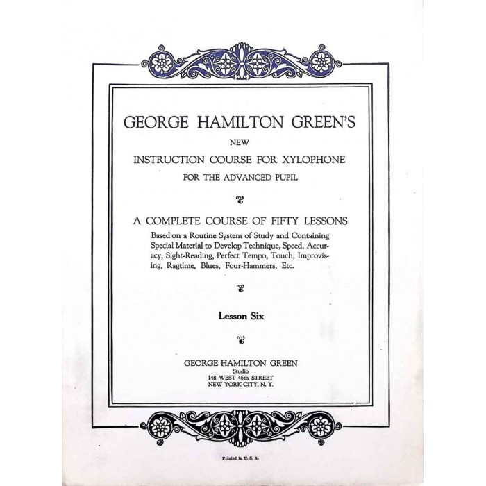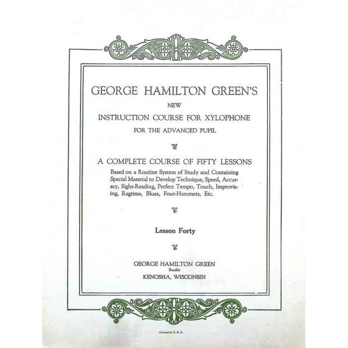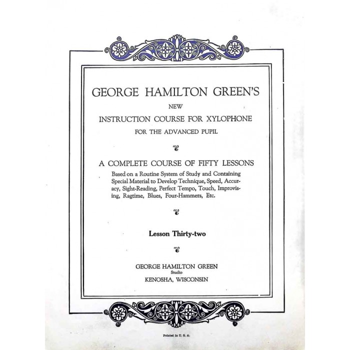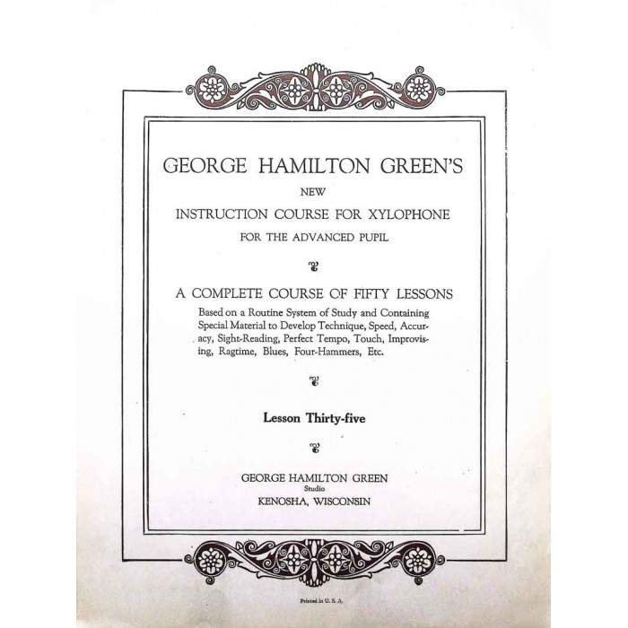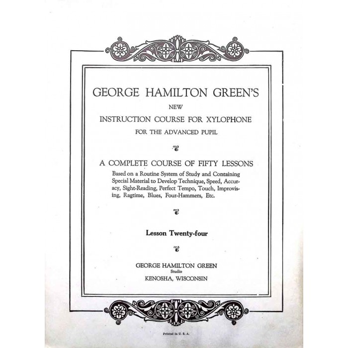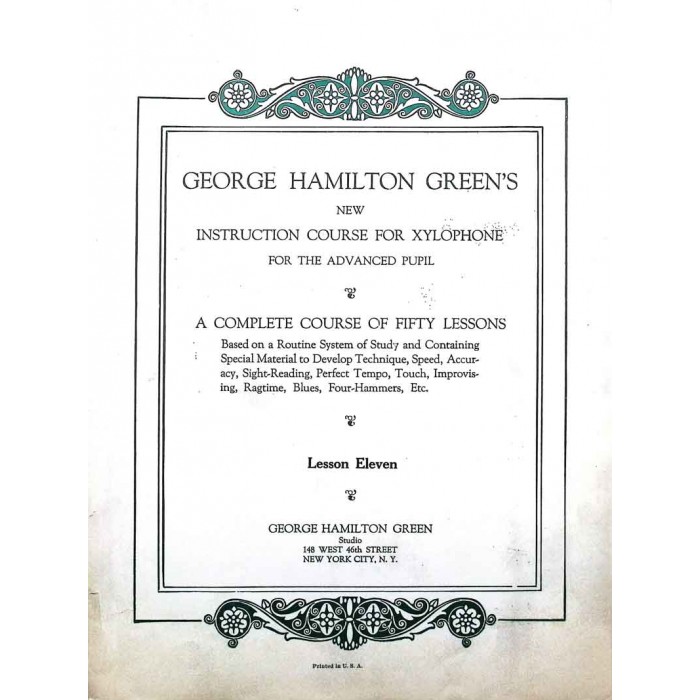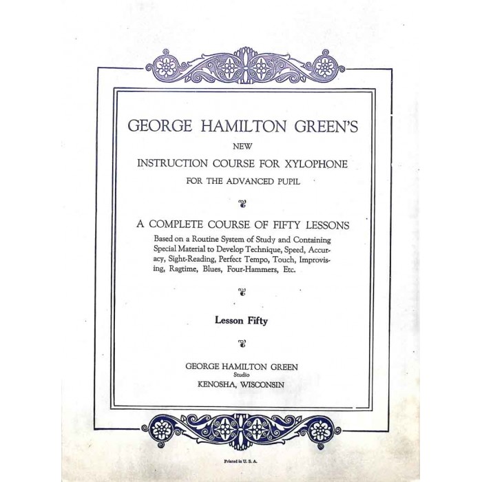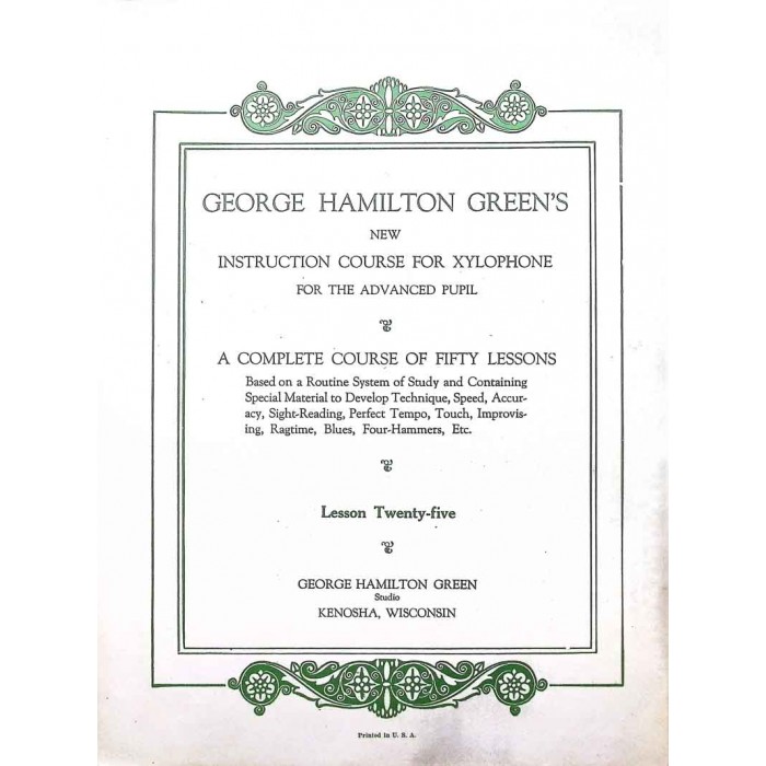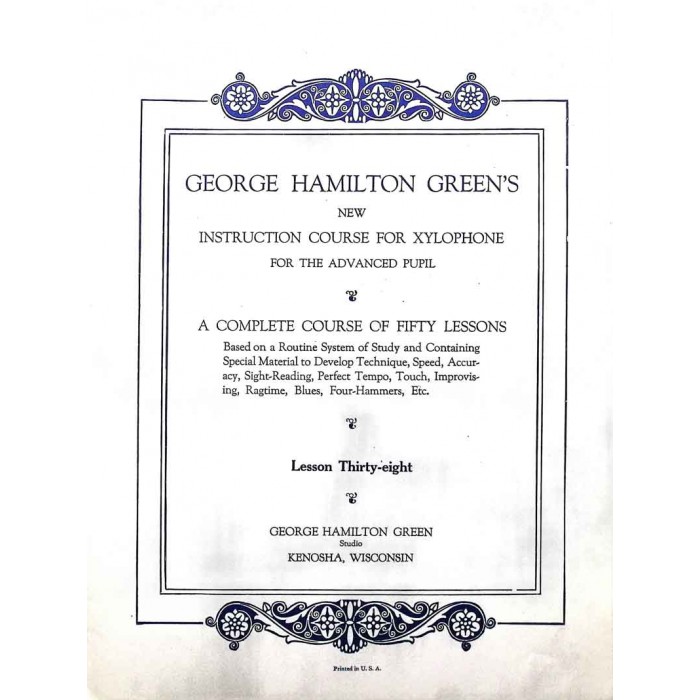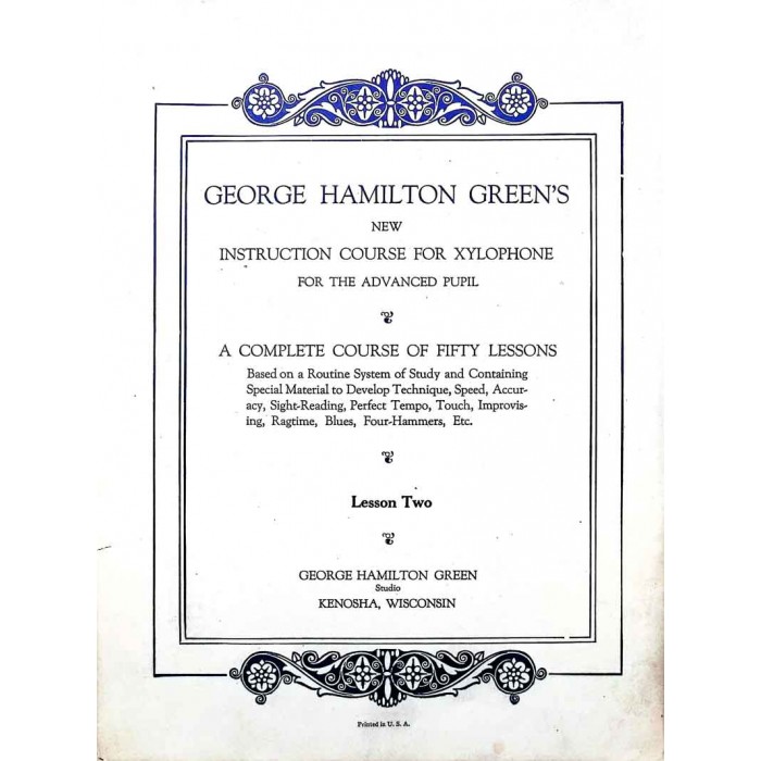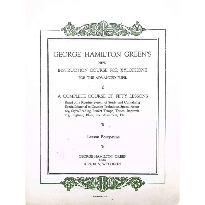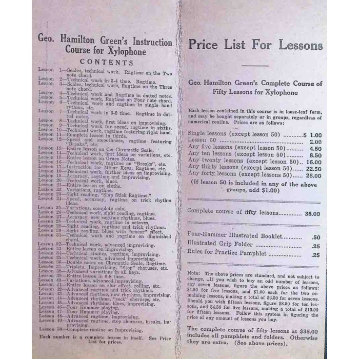 This is a beautiful collection of complete, original edition, George Hamilton Green "Instruction Course for Xylophone" in its original carboard box. This collection includes all 50 individual lessons, each printed as a separate pamphlet. It also includes several additional items from Green's instruction course including his 8 page, "Four Hammer Playing" guide, 2 page, two mallet playing guide, 4 page Rules for Practice, and a catalog plice list for G. H. Green's printed instruction and solo works from the era. Each of the 50 pamphlets in this set is in excellent condition with no tearing or water damage. The original paper has yellowed slightly but the lessons are clearly visible and easily read. A few of the early lessons have separated along the pamphlet edge so they are individual pages. Each pamphlet has a beautifully decorated front cover in various colors. Most of the pamphlets have other George Hamilton Green publications listed on the back cover. These 50 lessons are a great resource for the mallet percussionist and ragtime soloist that are still practiced and studied today, almost 100 years after they were copyrighted in 1926. These original editions will serve as the centerpiece to any keyboard percussion library.