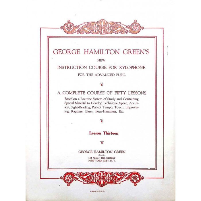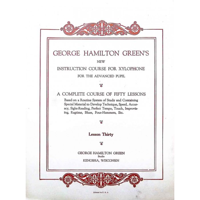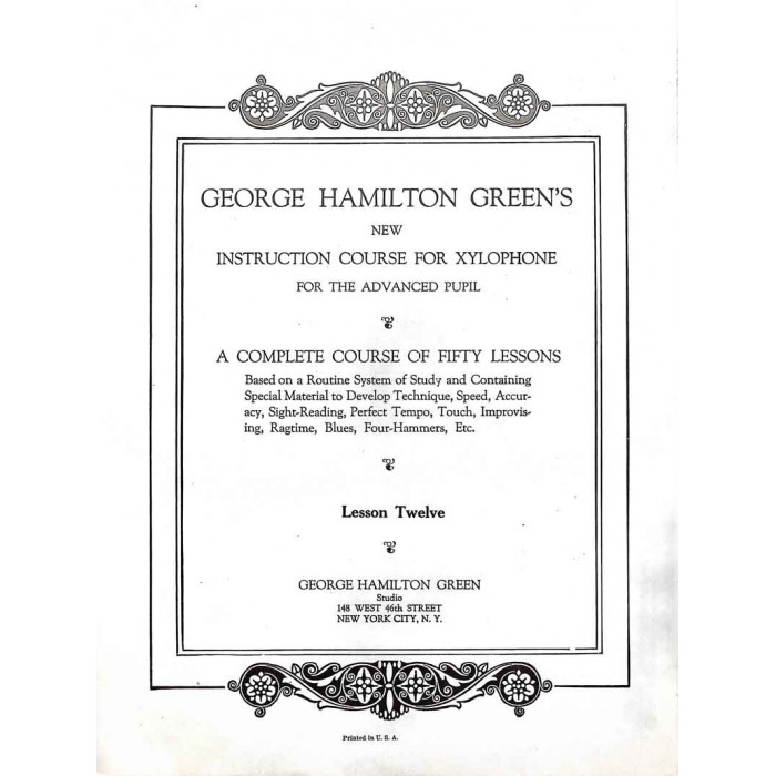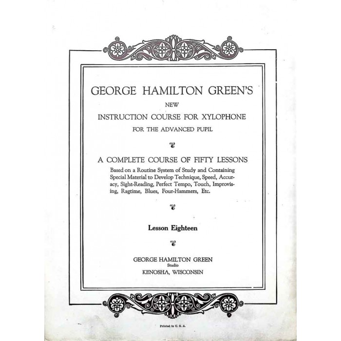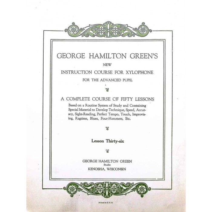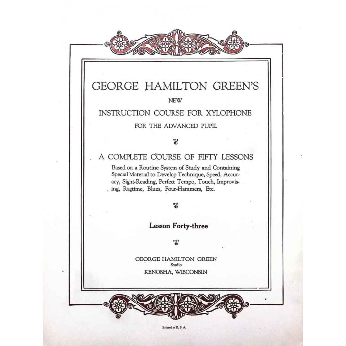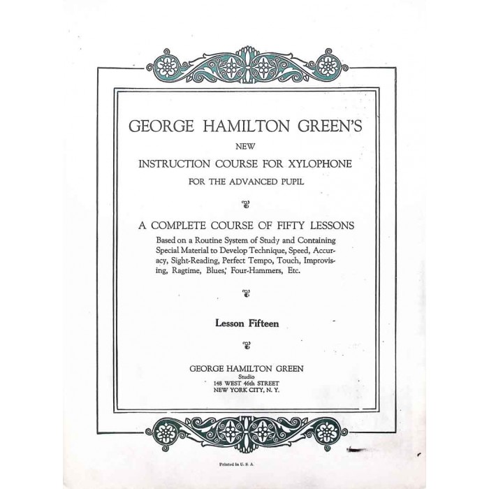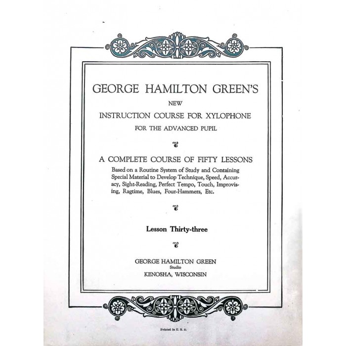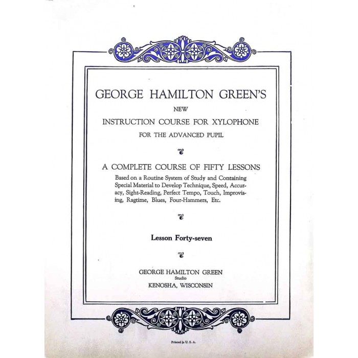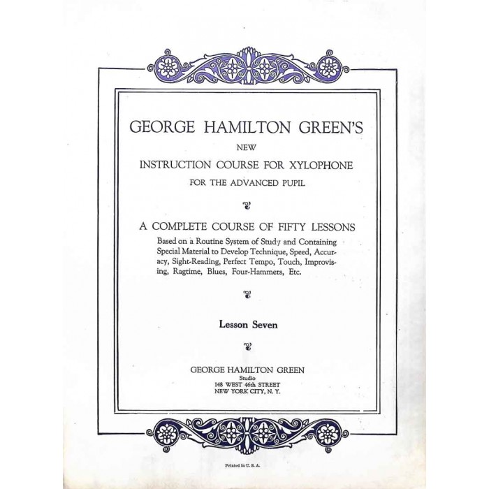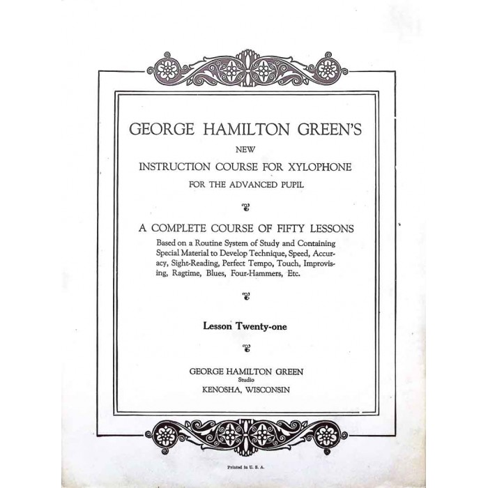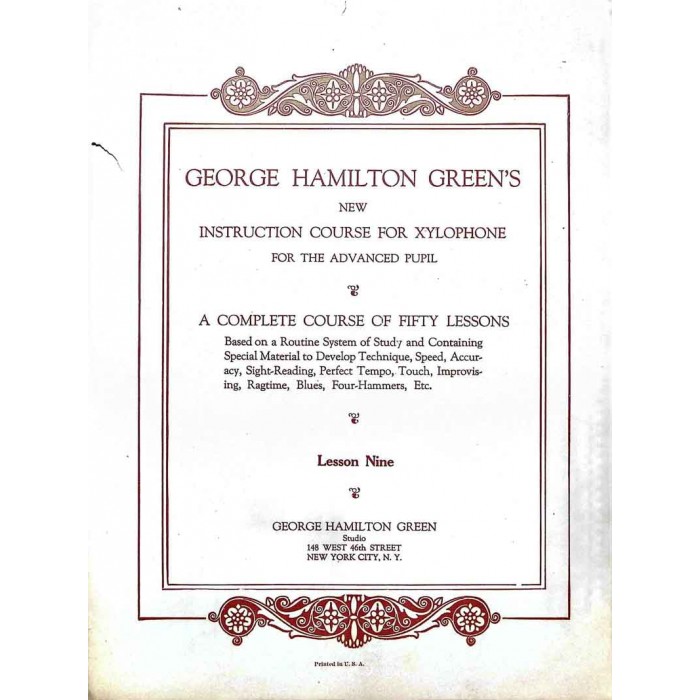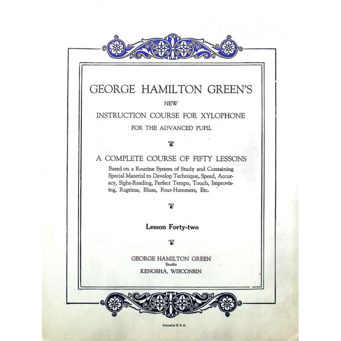This is a beautiful collection of complete, original edition, George Hamilton Green "Instruction Course for Xylophone" in its original carboard box. This collection includes all 50 individual lessons, each printed as a separate pamphlet. It also includes several additional items from Green's instruction course including his 8 page, "Four Hammer Playing" guide, 2 page, two mallet playing guide, 4 page Rules for Practice, and a catalog plice list for G. H. Green's printed instruction and solo works from the era. Each of the 50 pamphlets in this set is in excellent condition with no tearing or water damage. The original paper has yellowed slightly but the lessons are clearly visible and easily read. A few of the early lessons have separated along the pamphlet edge so they are individual pages. Each pamphlet has a beautifully decorated front cover in various colors. Most of the pamphlets have other George Hamilton Green publications listed on the back cover. These 50 lessons are a great resource for the mallet percussionist and ragtime soloist that are still practiced and studied today, almost 100 years after they were copyrighted in 1926. These original editions will serve as the centerpiece to any keyboard percussion library.