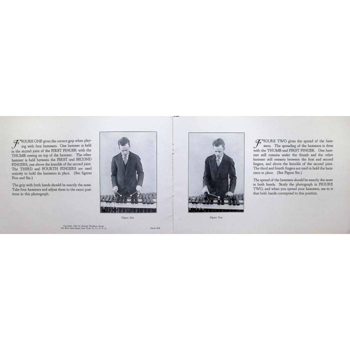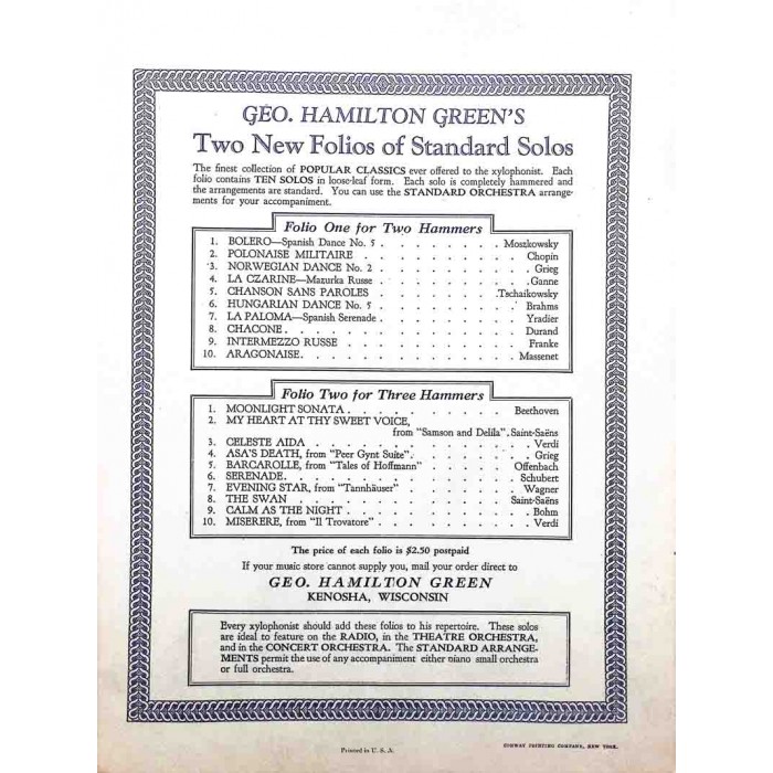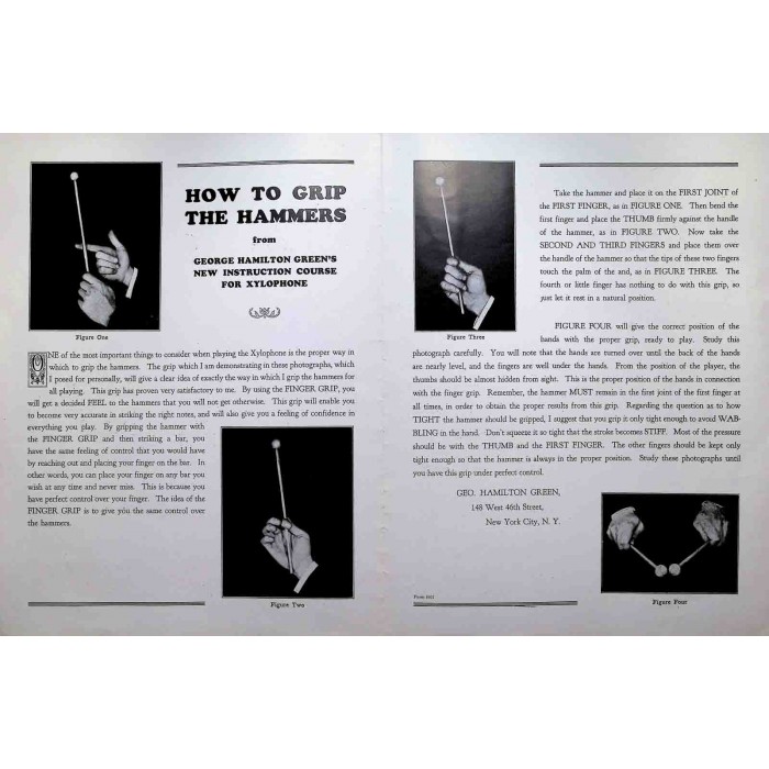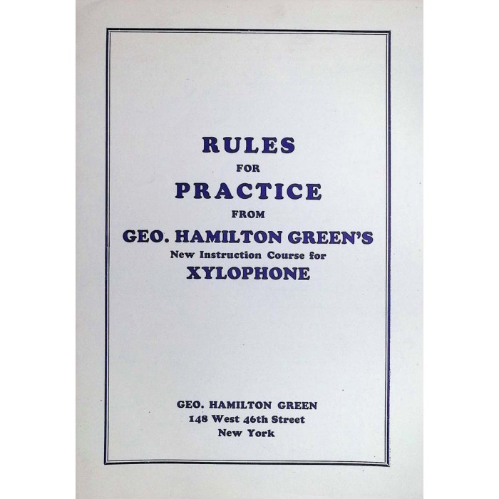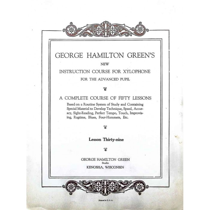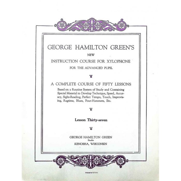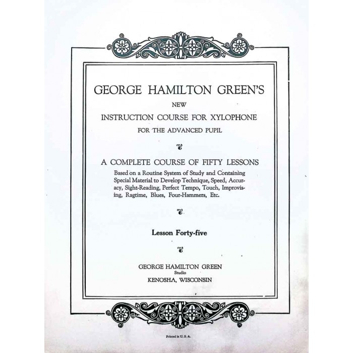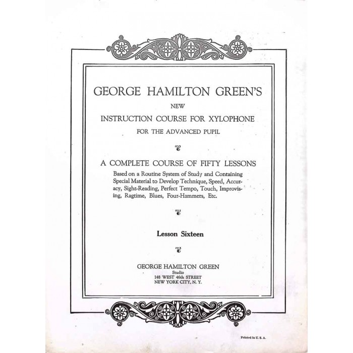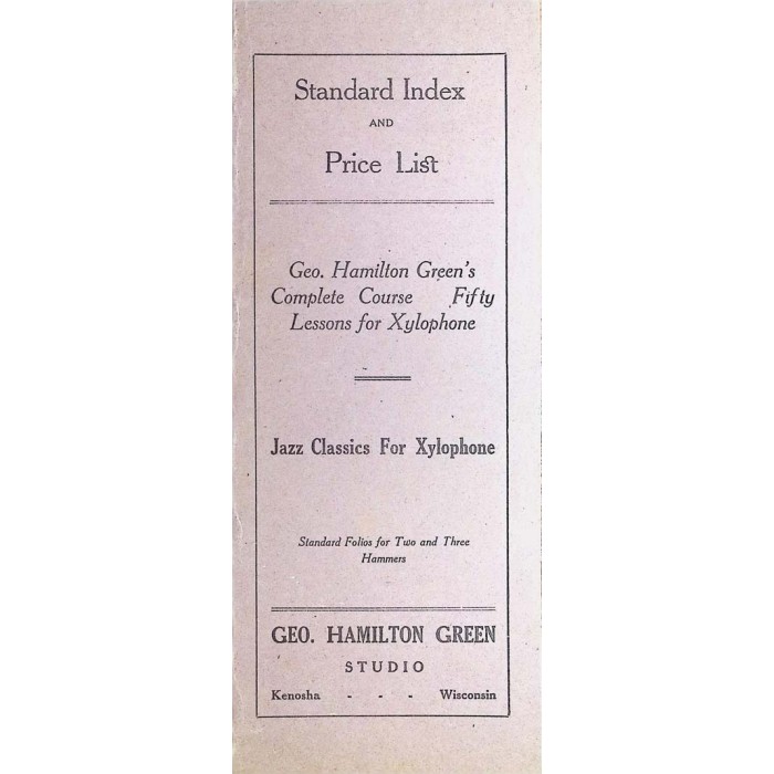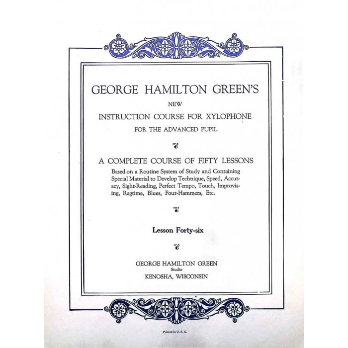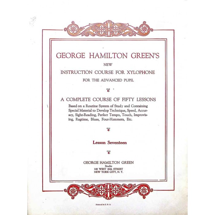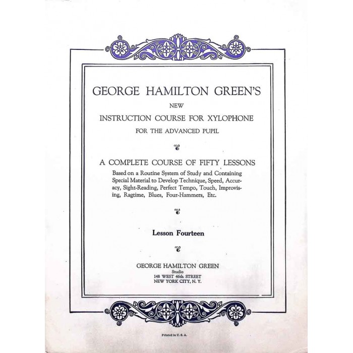 This is a beautiful collection of complete, original edition, George Hamilton Green "Instruction Course for Xylophone" in its original carboard box. This collection includes all 50 individual lessons, each printed as a separate pamphlet. It also includes several additional items from Green's instruction course including his 8 page, "Four Hammer Playing" guide, 2 page, two mallet playing guide, 4 page Rules for Practice, and a catalog plice list for G. H. Green's printed instruction and solo works from the era. Each of the 50 pamphlets in this set is in excellent condition with no tearing or water damage. The original paper has yellowed slightly but the lessons are clearly visible and easily read. A few of the early lessons have separated along the pamphlet edge so they are individual pages. Each pamphlet has a beautifully decorated front cover in various colors. Most of the pamphlets have other George Hamilton Green publications listed on the back cover. These 50 lessons are a great resource for the mallet percussionist and ragtime soloist that are still practiced and studied today, almost 100 years after they were copyrighted in 1926. These original editions will serve as the centerpiece to any keyboard percussion library.