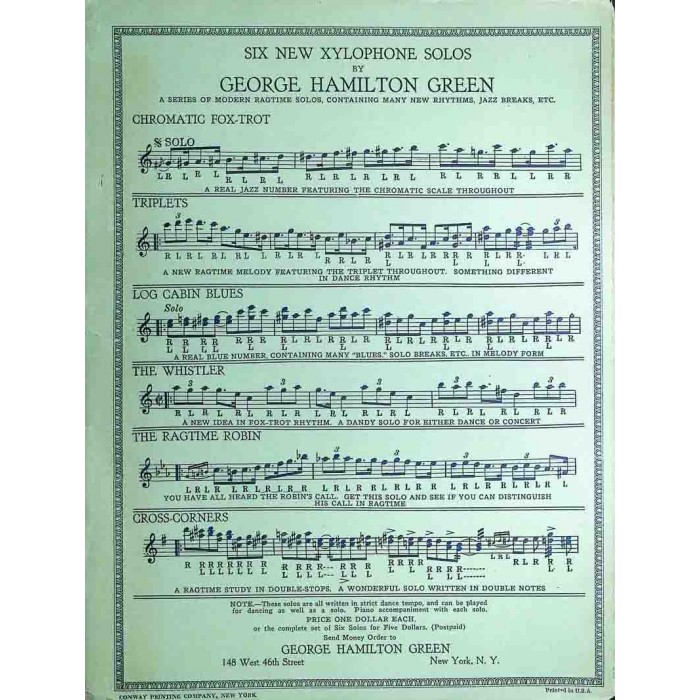 This is an original George Hamilton Green publication of "The Whistler" printed in 1924. "The Whistler" is one of Green's most famous ragtime solos. This is original copy, self published in 1924 by George Hamilton Green comes complete with xylophone solo and piano accompaniment along with a nice glossy cover featuring George Hamilton Green himself on the front with a list of the six solos he had published during this period. The back cover features snippets from each of the six solos along with publishing information. This copy is in good overall condition. There is some tape along the edges of the parts that was added for protection and the cover is separated aong the spine as are the parts there are two tiny tears inside but they do not affect the printed music. This is a rare original edition of a famous ragtime solo from the iconic George Hamilton Green that will make an exciting addition to any percussion library.