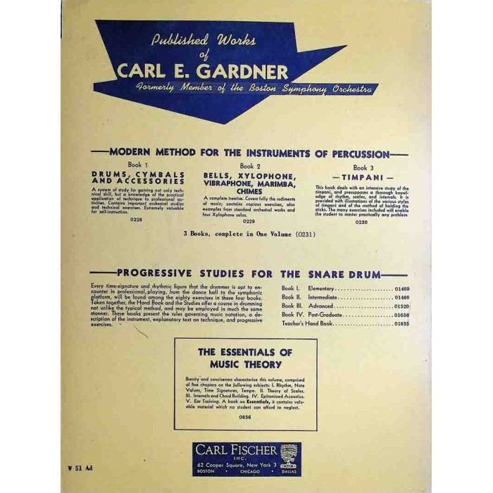 This is a classic revised and enlarged edition of the Gardner Modern Method for the Bells, Xylophone, Marimba & Chimes published in 1919 by the Carl Fischer music house. This is the second of three method books that make up the comprehensive instruction course by Carl Gardner who was a member of the Boston Symphony Orchestra during the early part of the 20th century. This instruction course includes descriptions, pictures, exercises, etudes, and solos. This copy is in mint condition with no pencil marks, tears, or dog eared pages. This is a rare copy of an early edition of this historic method book that will make a nice addition to any music collection.