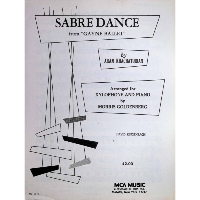 This is an early edition of "Sabre Dance" arranged for xylophone solo. "Sabre Dance" is from the Gayne Ballet composed by Aram Khachaturian and arranged for xylophone solo by the inimitable Morris Goldenberg. This original edition, published in 1948 by MCA Music.is in mint condition. It includes a solo part and separate piano accompaniment inside a booklet. There are no damaged pages and no marks of any kind in the music. This original edition will make a great addition to any percussion music library.