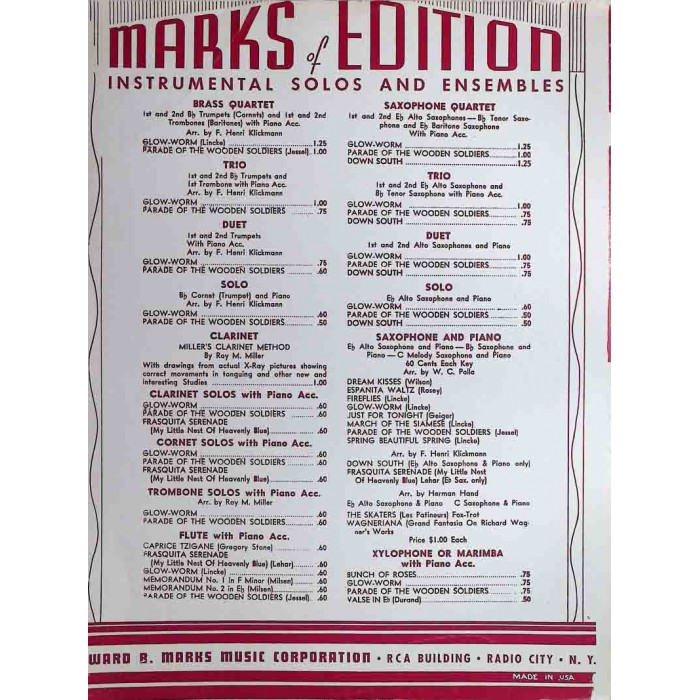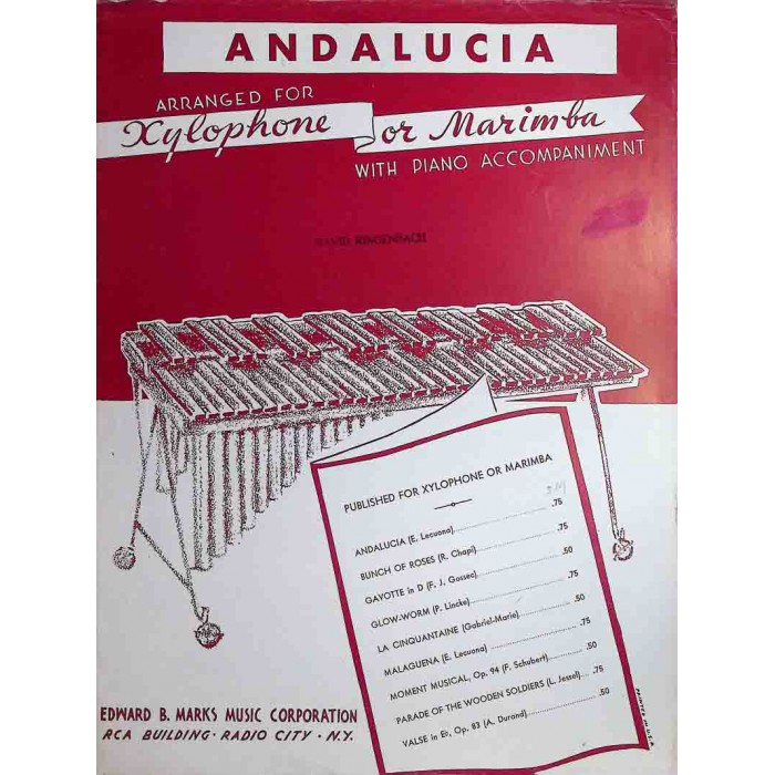 This is an original edition of "Andalucia" arranged for xylophone/marimba solo. "Andalucia" is from a suite composed by Ernesto Lecuona and arranged for keyboard percussion by Howard Peterson. This original edition, published in 1932 by Edward Marks at Radio City in NY is in mint condition. It includes a solo part and separate piano accompaniment inside a glossy booklet. There are no damaged pages and no marks of any kind in the music. This colorful edition will make a great addition to any percussion music library.