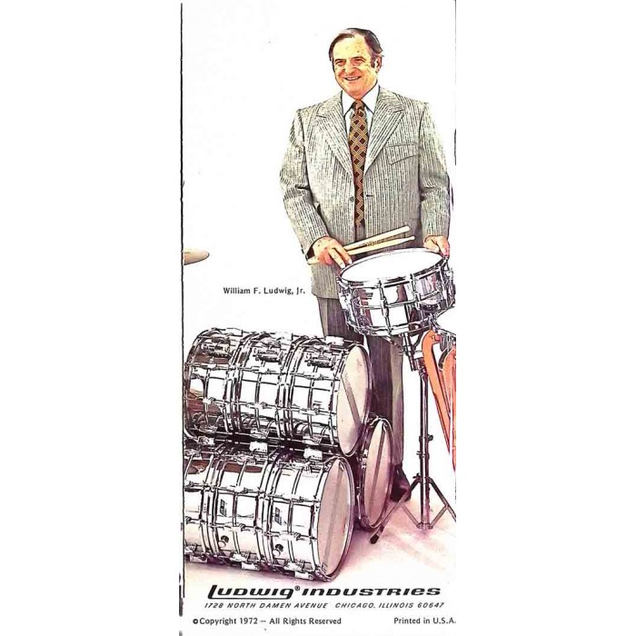 William F. Ludwig drummer's biography from 1972. The Ludwig drum company published these small pamphlets highlighting the career of W. F. Ludwig and the Ludwig drum company through the years. This 1972 edition is in excellent condition and includes W.F. Ludwig Jr. and W. F. Ludwig III on the back foldout cover. There are no tears or pencil marks on any of its 42 glossy pages. Chocked full of background information about the Ludwig drum company providing great historical information about the company and a great collectible for the Ludwig enthusiast.