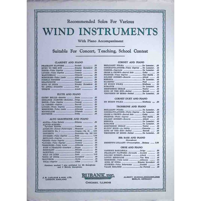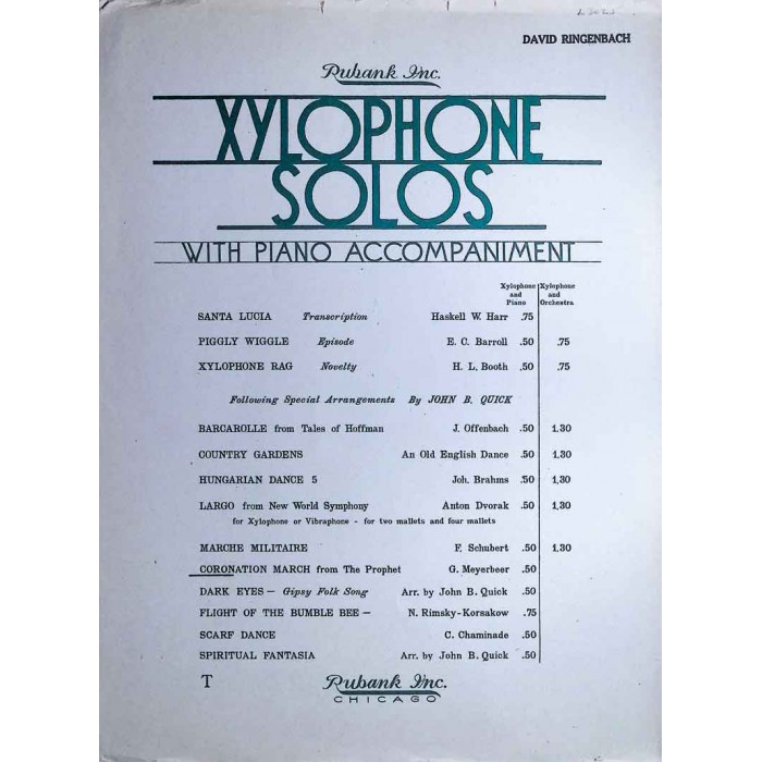 This is an original edition of "Coronation March" arranged for xylophone solo. "Coronation March" is from the opera The Prophet composed by Meyerbeer and arranged for keyboard percussion by John Quick. This original edition, published in 1935 by Rubank Inc.is in excellent condition. It includes a solo part and separate piano accompaniment inside a booklet. There are no damaged pages and no marks of any kind in the music. The front cover features a list of other xylophone solos published by Rubank in the 1930's. This original edition will make a great addition to any percussion music library.