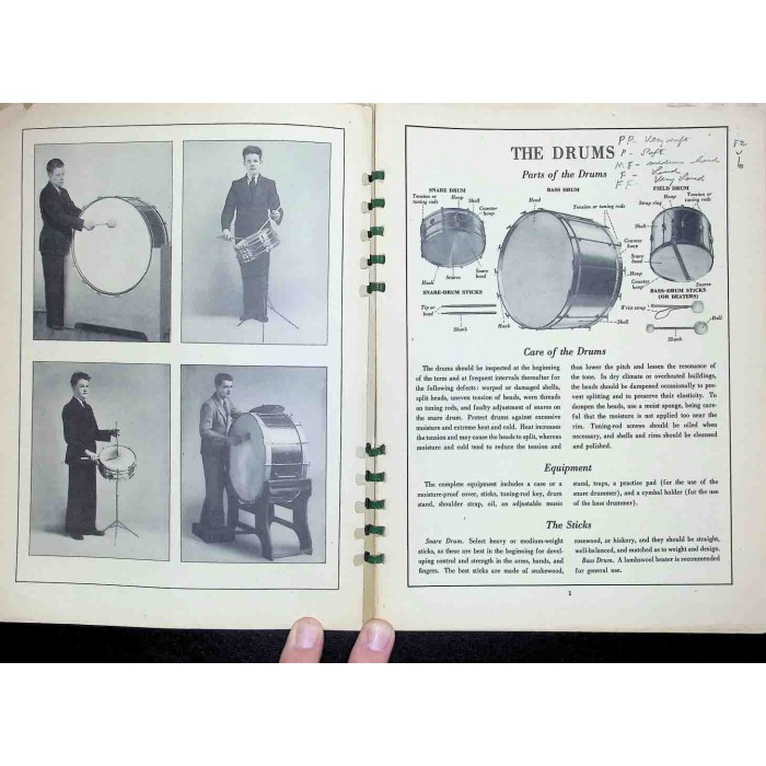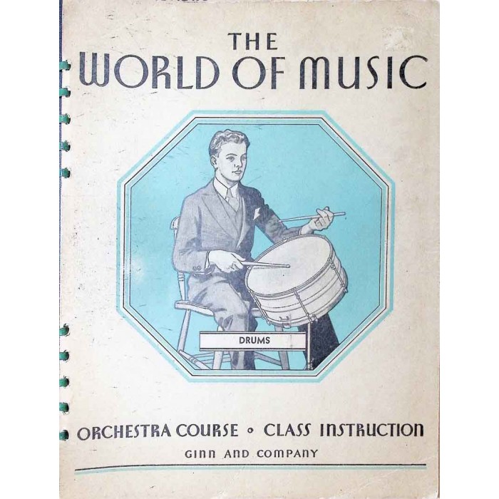 This is a rare copy of the World of Music class instruction drums book published in 1937. These were published for music classes by Ginn and Company to be used in conjunction with other instrumentalists as shown on the back cover. The series contributors include William Revelli, the director of bands for many years at the University of Michigan. There are some great pictures inside of 1930's orchestral percussion instruments. This copy is in great overall condition with just a little fraying along some of the page edges. It is bound in a spiral booklet form that is in tact. This will make an interesting addition to any vintage percussion music collection.