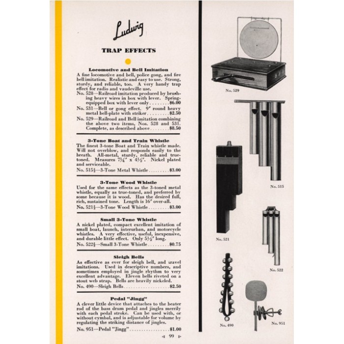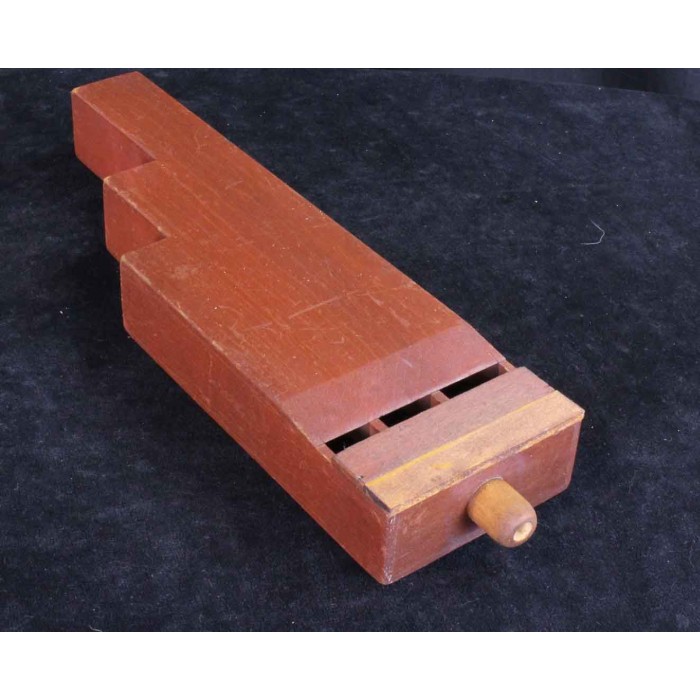 This is a great sounding Ludwig 3-tone wooden whistle from the early 1930's. As shown in the attached page from the 1933 Ludwig catalog, this is a large three fluted whistle measuring 16" in length by 4 3/8" W x 1 3/4" H. It produces a big mellow sound that can be used as a train or boat imitation. It is in great overall condition with a small repair to the top and a reproduction mouthpiece. This quintessential sound effect will make a great addition to any sound effect collection or trap display.