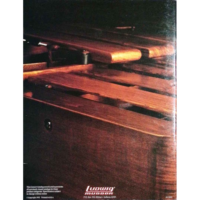 This is a complete Ludwig-Musser concert percussion catalog from 1992. It contains 36 full color pages describing all of the concert percussion offerings from Ludwig and Musser including Ringers timpani, Musser marimbas, mallets , cases and the like. This copy is in excellent overal condition with no damaged or missing pages. There are a few ink marks on one or two internal pages. This is a great resource for a Ludwig or Musser enthusiast.