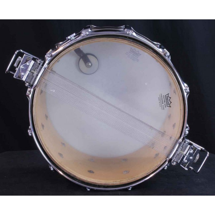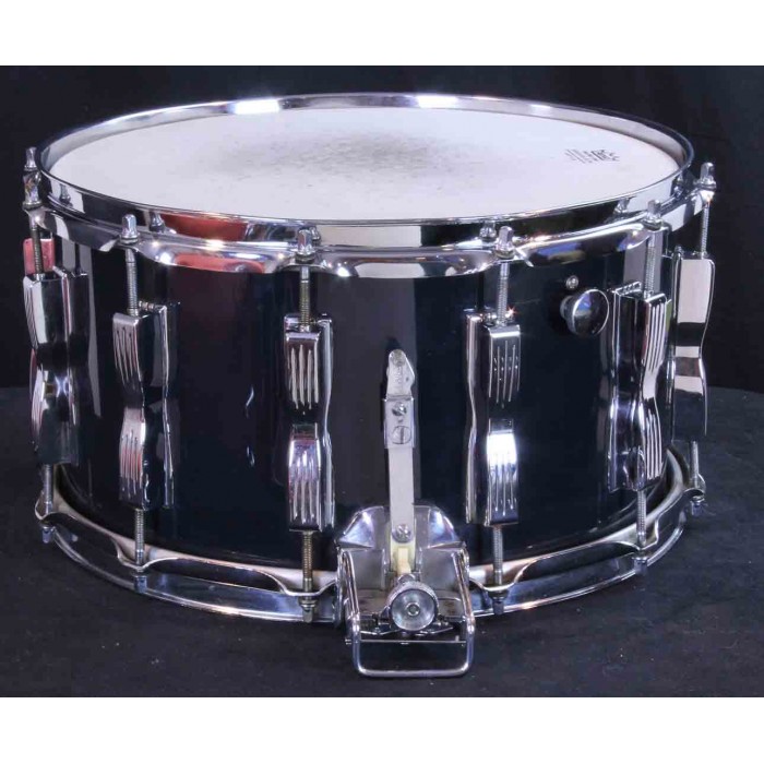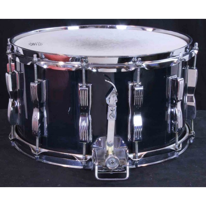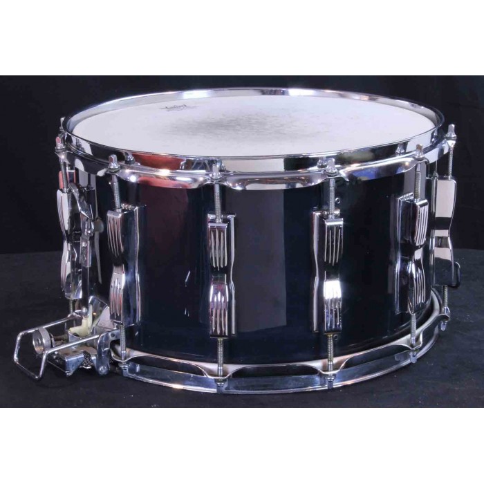 This is an early 1980's Ludwig Coliseum model with P-70 Super Sensitive strainer. The 8" x 14" Coliseum model, with its 12 lugs, was only shown in the early 80's catalogs with a P-85 or P-87 strainer making this drum something of a rarity. It is completely original with original, non-adjustable, Ludwig wires, internal muffler and 12 bowtie lugs. The black cortex covering is in excellent condition and all parts work perfectly. There is no rust or corrosion on any of the chrome plated hardware. The combination of the heavy 6-ply shell without reinforcement rings, elegant black cortex covering, and the Super strainer make this a great choice for an orchestral snare drum.