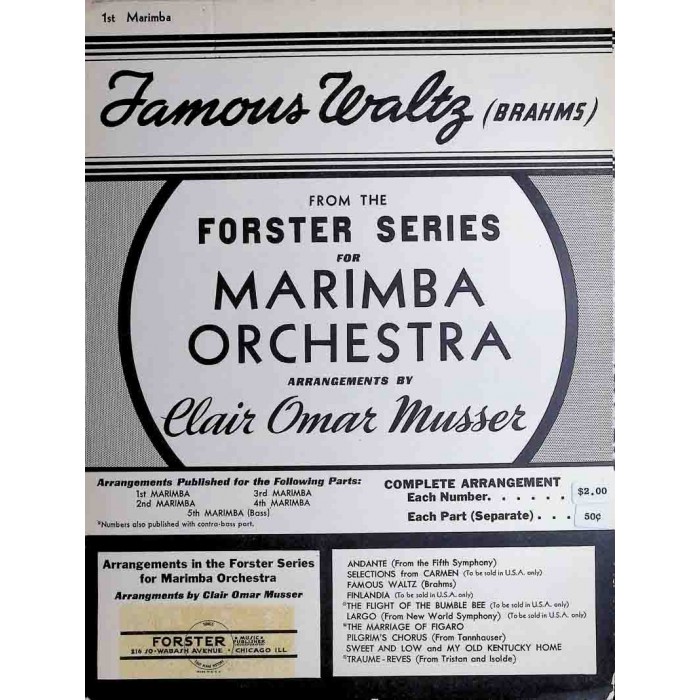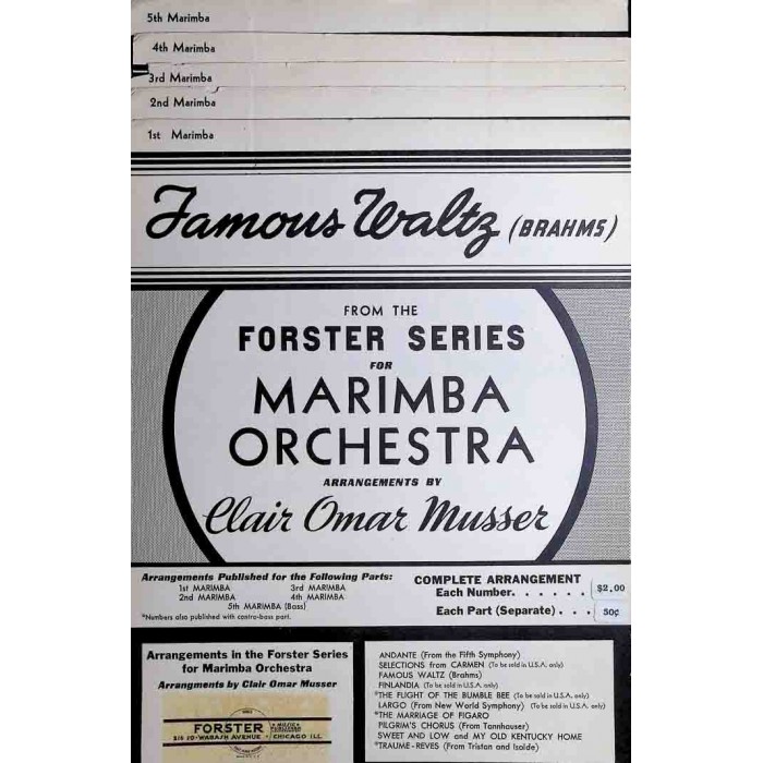 This is an original edition set of parts for "Famous Waltz (Brahms)", arranged for marimba orchestra by Clair Omar Musser. This Famous Waltz, composed by Brahms, is one of his most recognizable melodies. This version, arranged by Musser and published by Forster in 1941, includes 5 separate parts for marimbas 1 - 5. Each part is contained within its own booklet, complete with cover page. All of the parts are included and each is in excellent condition. Each of these copies is in near mint condition. Musser's marimba orchestra from the late 1930's was famous for its world tour using King George model Deagan marimbas. The Forster arrangements are almost certainly part of the repertoire that Musser arranged for the tour. It is exciting to see this original edition that is one of twelve offered by Forster along with solos and master works, as shown in the attached Forster catalog. This set of parts will make an exciting addition to any percussion music library.