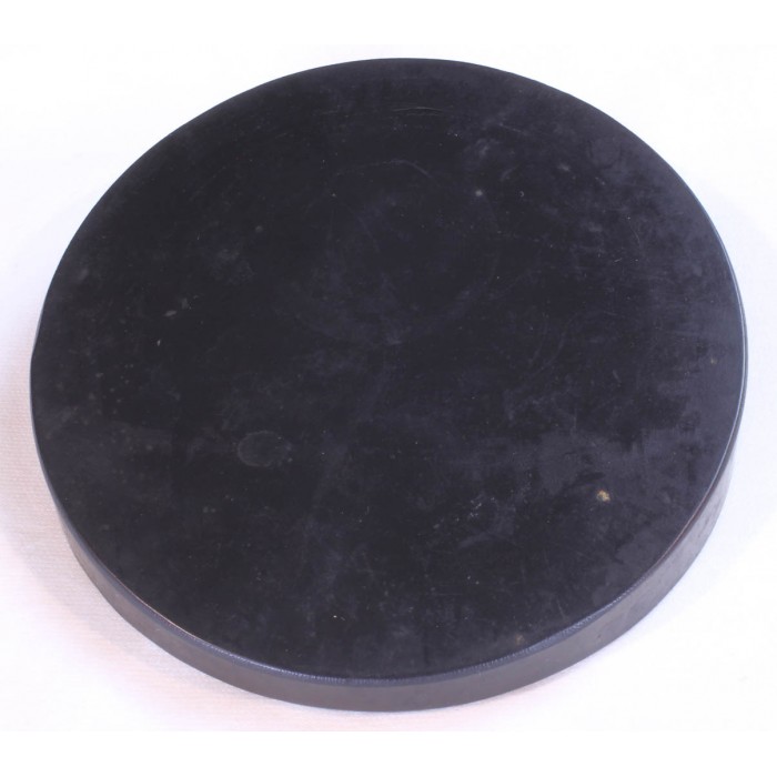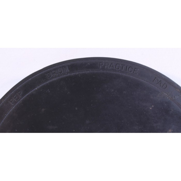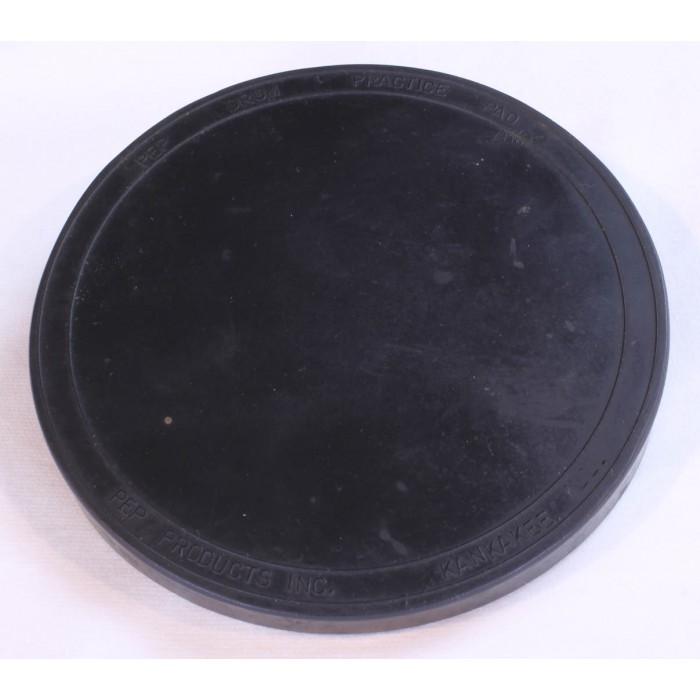 This is a vintage PEP practice pad from the 1960's in near mint condition. The pad is a solid piece of black rubber measuring 5" in diameter that has a wedge shape which places the striking surface at an angle for traditional grip players. The edge of the pad shows a clear manufacturers mark "PEP Kankakee, Ill". The rubber is supple and there are no cracks or gouges around the edges making this a great candidate for use or a vintage practice pad collection.