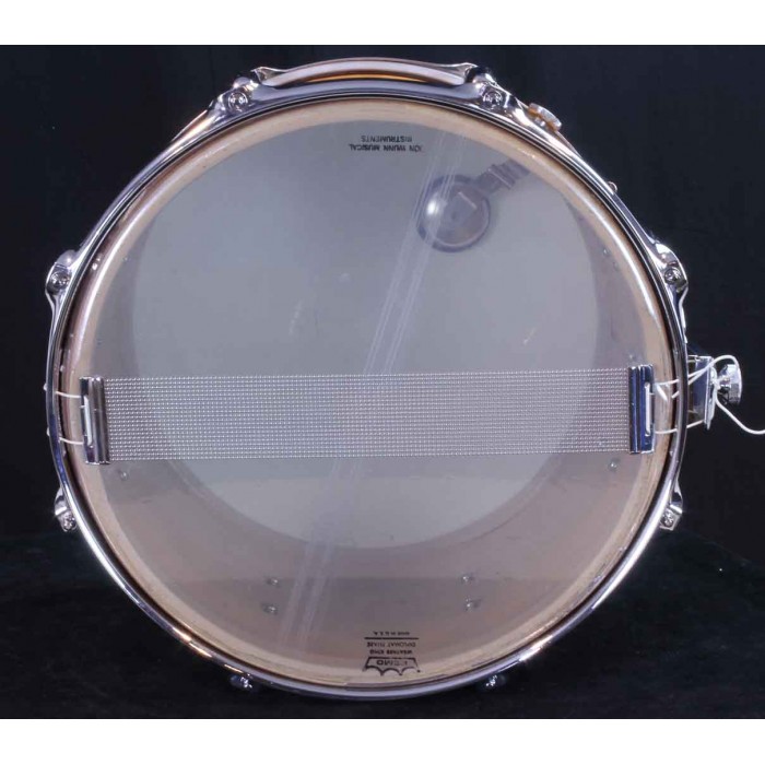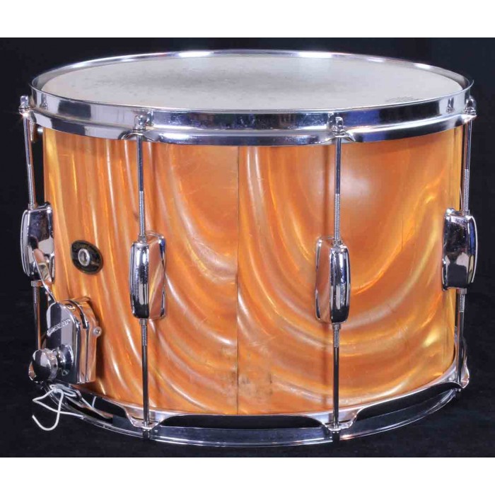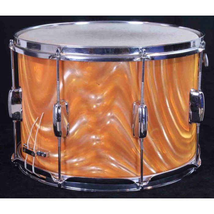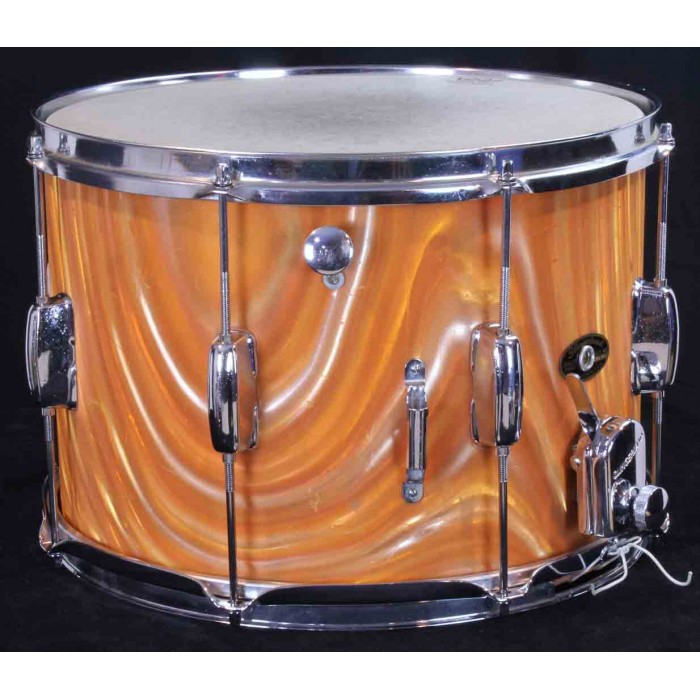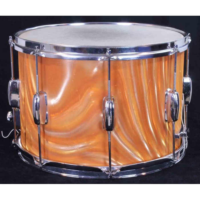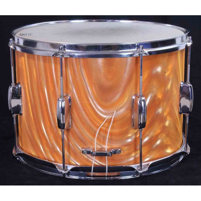 This is a Slingerland Parade King field drum from the 1970's in rare tangerine satin flame pearl wrap. As shown in the attached 1973 Slingerland catalog, the model 704 parade drum has a 10" x 14" shell and Zoomatic strainer. The tangerine satin flame wrap was offered for a short time by Slingerland making it one of the harder to find finishes from this era. It is in very good overall condition with some blemishes and scratches in the wrap but there are no breaks or cracks and it still has a bright tangerine orange color. It has the original Zoomatic strainer but many of the other parts have been replaced. The rims are chrome over steel triple flanged hoops, the tension rods are modern replacements and the butt plate has been upgraded. The interios of the drum is painted with a milk chocolate color. This is a great shell size for a deep drum set snare that will make a great rare addition to a tangerine satin flame outfit or drum line.