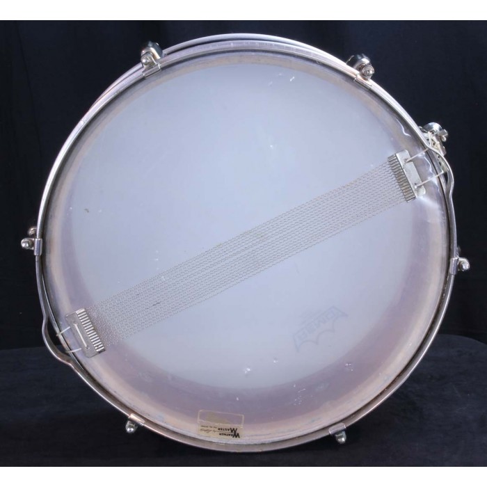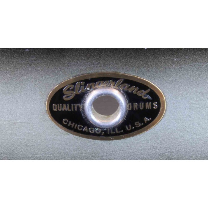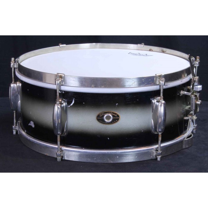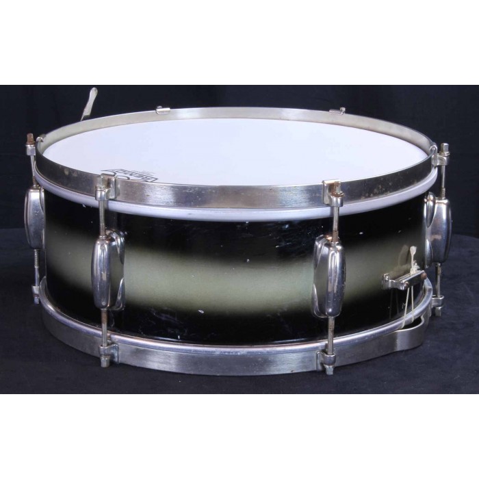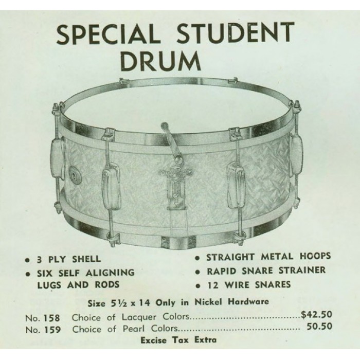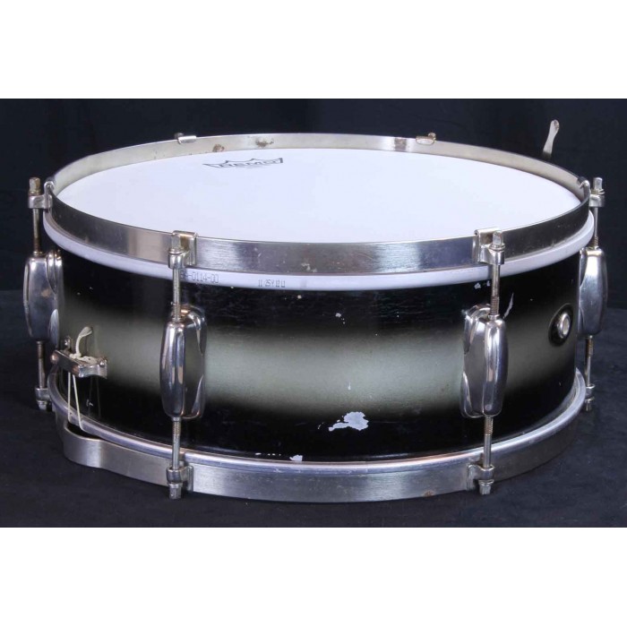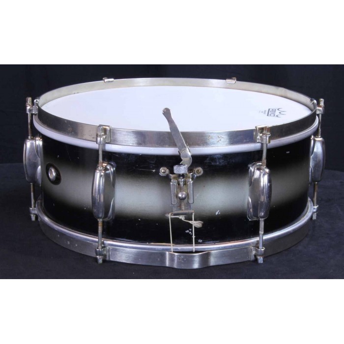 This is a Slingerland Special Student model snare drum from 1955. As shown in the attached 1955 Slingerland catalog, this snare has a 5 1/2" x 14". 3-ply shell, three point throw off, six sound king lugs, and straight, no flange rims. All of the nickel plated hardware is in good condition. The black and silver two-tone duco finish is in good overall condition with a few chips but but no flaking. The original first version black and brass badge and snappy snare wires are also original to the drum. This is an unusual, transition model Slingerland snare drum that will make a nice collectible or player's drum for a 1950's Slingerland outfit.