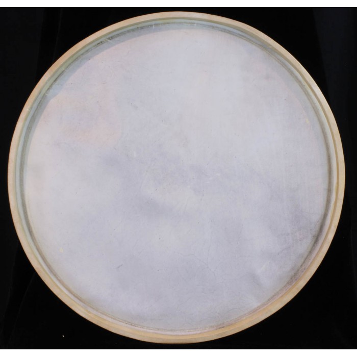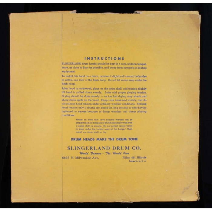 This is a Slingerland brand genuine calf tom tom head in near mint condition with its original carboard sleave. This 16" head doesn't look like it was ever mounted on a drum. There is a small collar but there are no stick marks or stretch marks. The ink Slingerland genuine calc ink stamp is clearly visible. The original Slingerland head box is in good shape. There are a few tears to the top flap but both sides of the box are in nice shape with bright colors. This head and box will make for a nice display for the Slingerland collector or can be mounted and played on a floor tom for a real authentic vintage look.