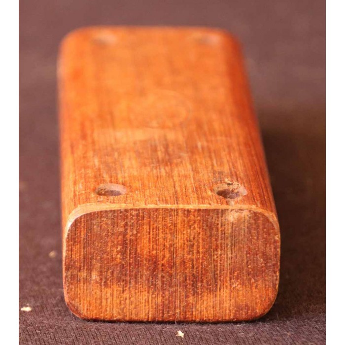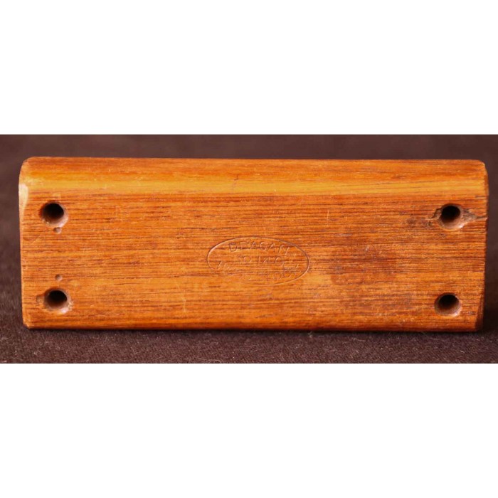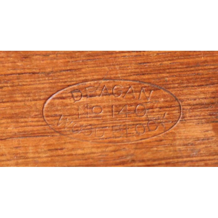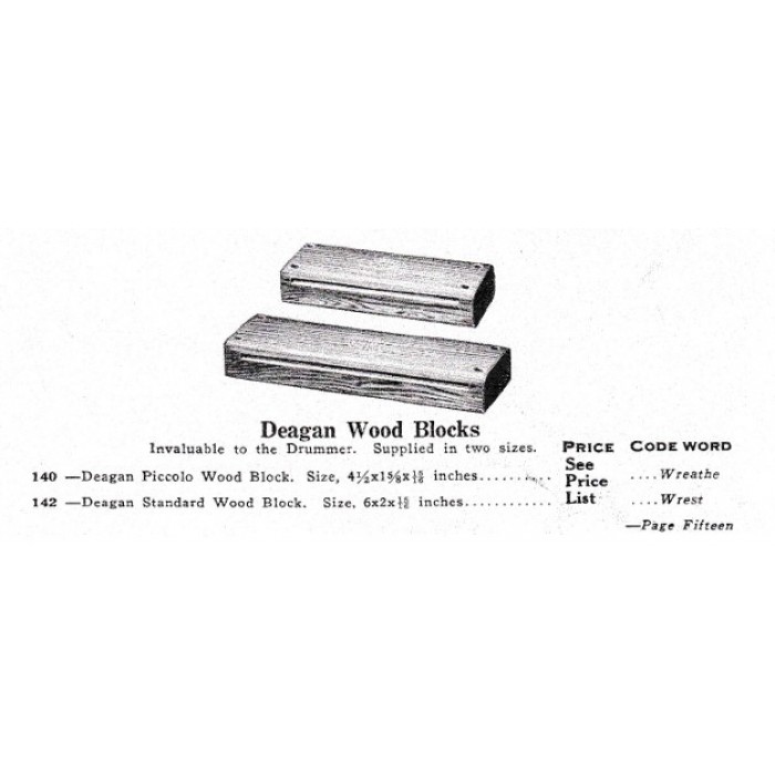Genuine Deagan No. 140 rosewood Piccolo Woodblock. Deagan made their piccolo woodblocks from scraps left over from their rosewood keyboard production. Deagan used only the best materials for their keyboards so these woodblocks are some of the best available and highly coveted instruments for percussionists. The catalog page shown is from an early Deagan catalog showing the two sizes Deagan produced. This block is the smaller model 140 made by the company measuring 4 1/2" x 1 5/8" x 15/16". There is a Deagan logo stamped into the top accompanied by the model number. This block is in excellent condition and has a beautiful high, piercing sound.